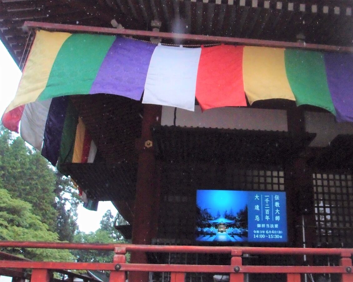 この日は法要に先立ち、1200年以上ともり続けている「不滅の法灯」が分灯され、大講堂に奉安。雨がふりしきるなか、厳かな声明が響きました。