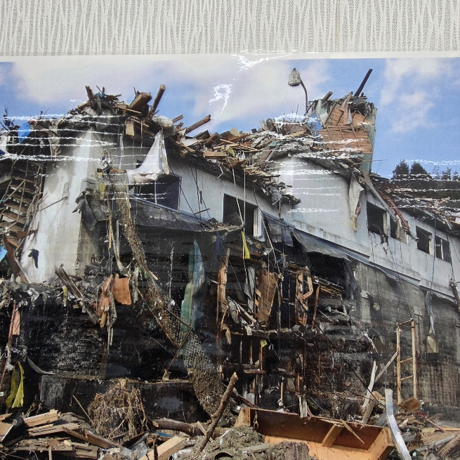 全壊した工場の鉄骨の端に津波で打揚げられた酒樽がまるで